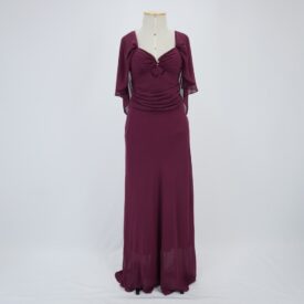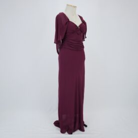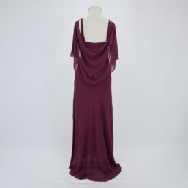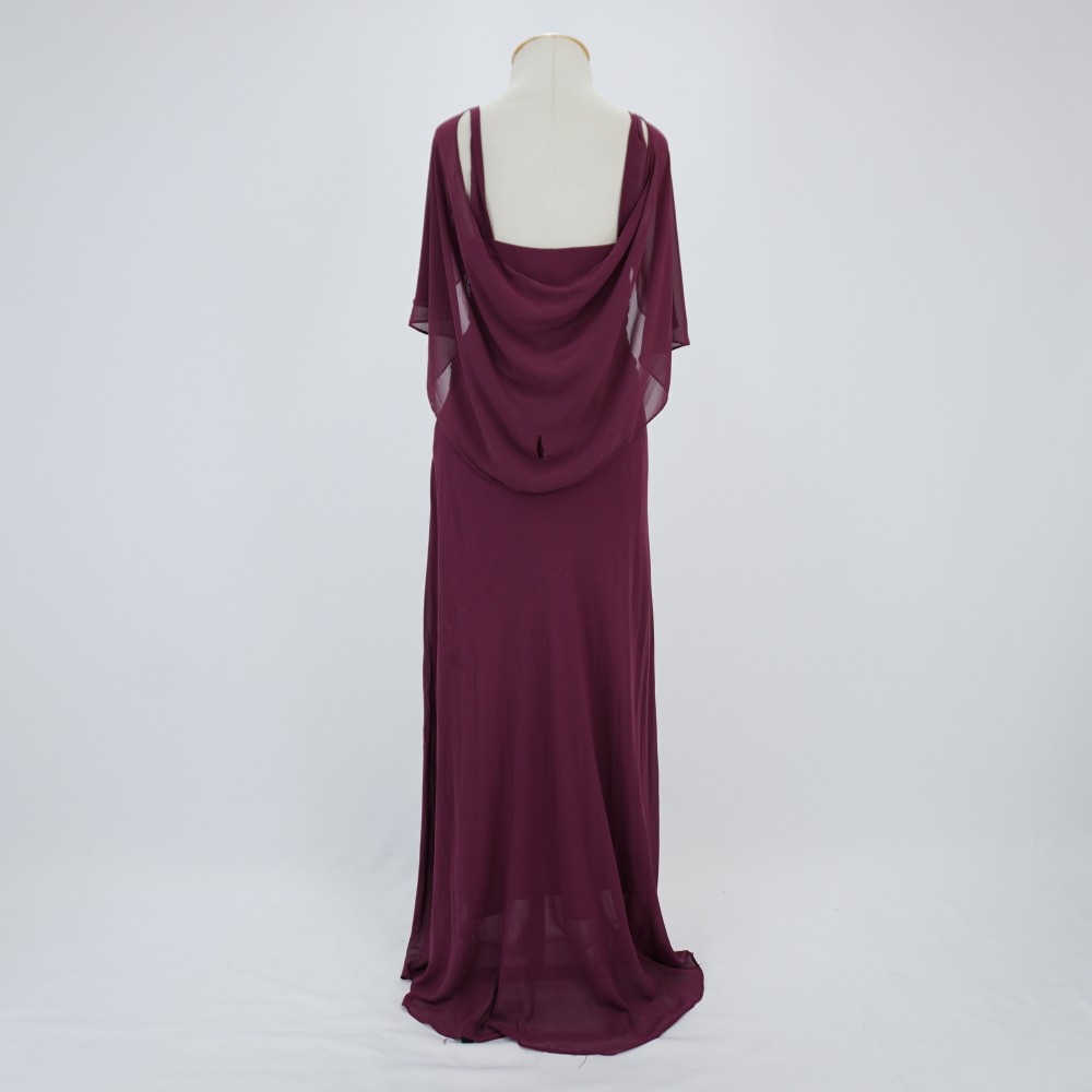 Vestido longo em georgette roxo com alças largas e decote profundo com detalhe central franzido no busto arrematado por aplicação de aviamento metálico com strass. Drapeados no busto e na cintura, possui mangas amplas integradas as alças formando um lenço. Bojo embutido e fechamento com zíper na lateral e colchete de gancho com forro.