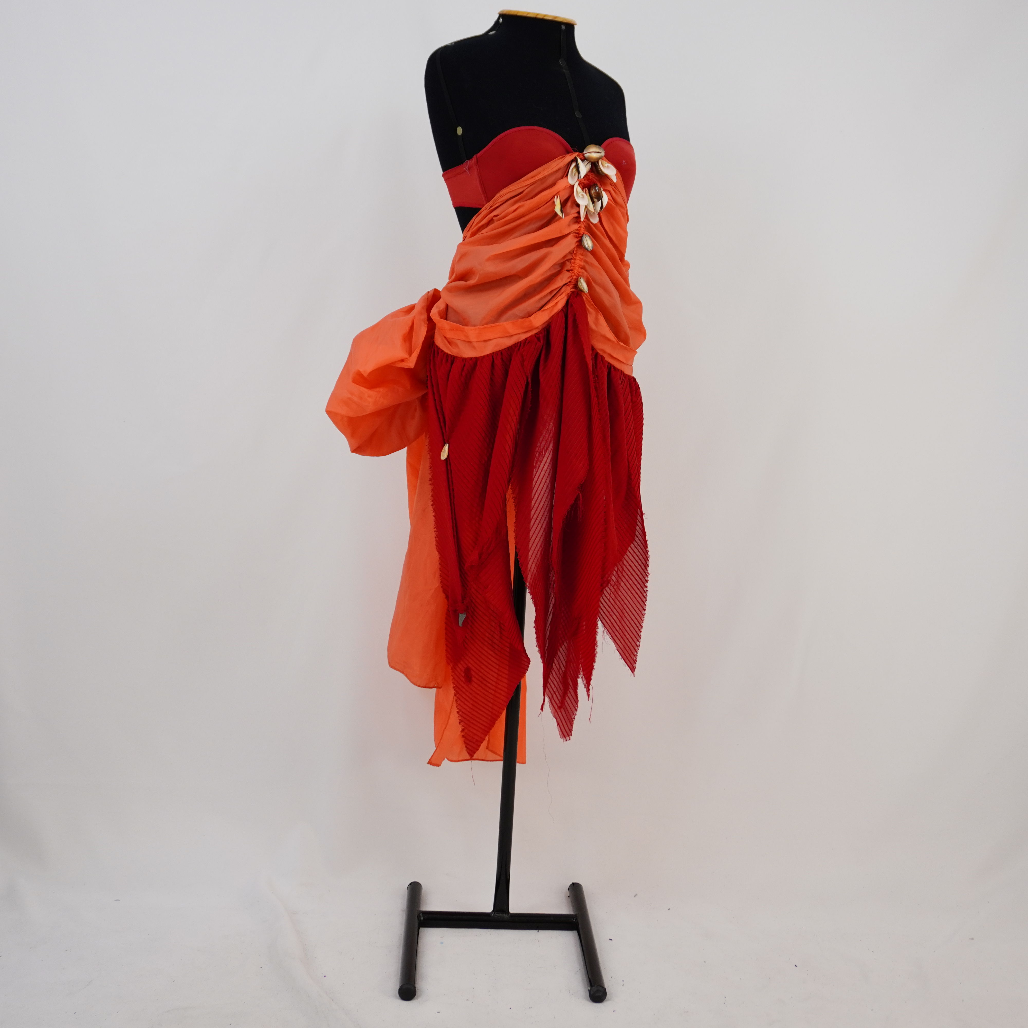 Top com aplicação de faixa longa e franzida no centro cor salmão. Abaixo do tecido salmão é costurado tecido plissado na cor vermelha, o suporte do top é feito com sutiã sem alça vermelho e no franzido central são aplicados buzios e conchas. Na ponta do tecido plissado existe em aviamento de ferro bem pesado.
