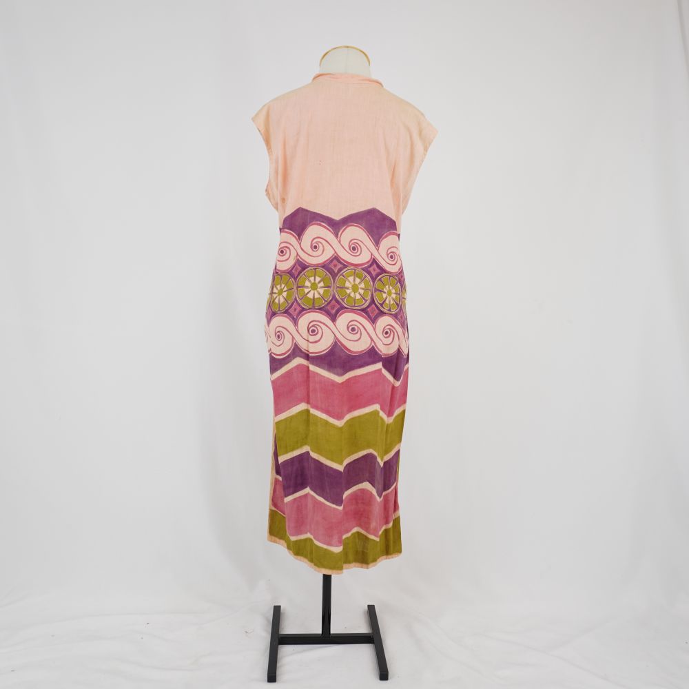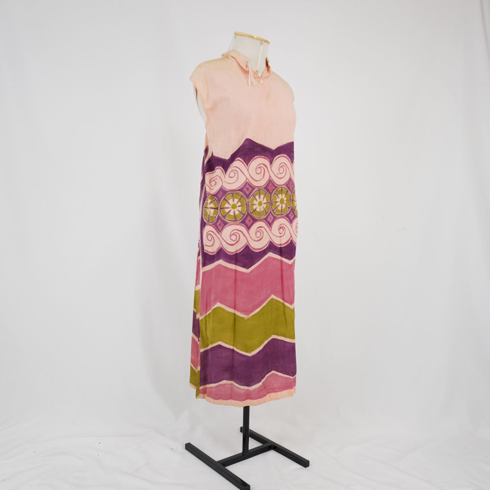 Vestido salmão Voltar U.LB.01.074 (1) U.LB.01.074 (2) U.LB.01.074 (3) Metadados Miniatura Compartilhe Número de TomboU.LB.01.074TítuloVestido salmãoDescriçãoVestido pintado a mão com base salmão e grafismos roxo, rosa e verde. Modelagem reta, sem manga, longuete, com gola padre e fechamento atrás com botõesLocalizaçãoSala 003ColeçãoColeção de Peças RarasDimensões do Item - altura x largura (cm)1220 x 63Material/Composição do ItemTecido plano de fibra natural rústicaEstado de ConservaçãoBomData da Catalogaçãonovembro 5, 2025 Mais Informações NotasAcervo pessoal Lina Bo Continuar navegando Vestido com grafismos Vestido florido Voltar para a lista de itens