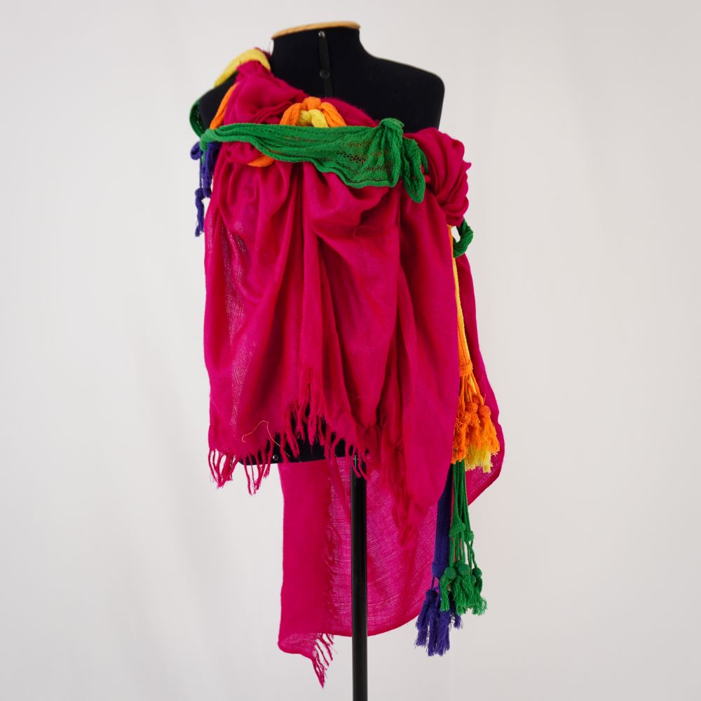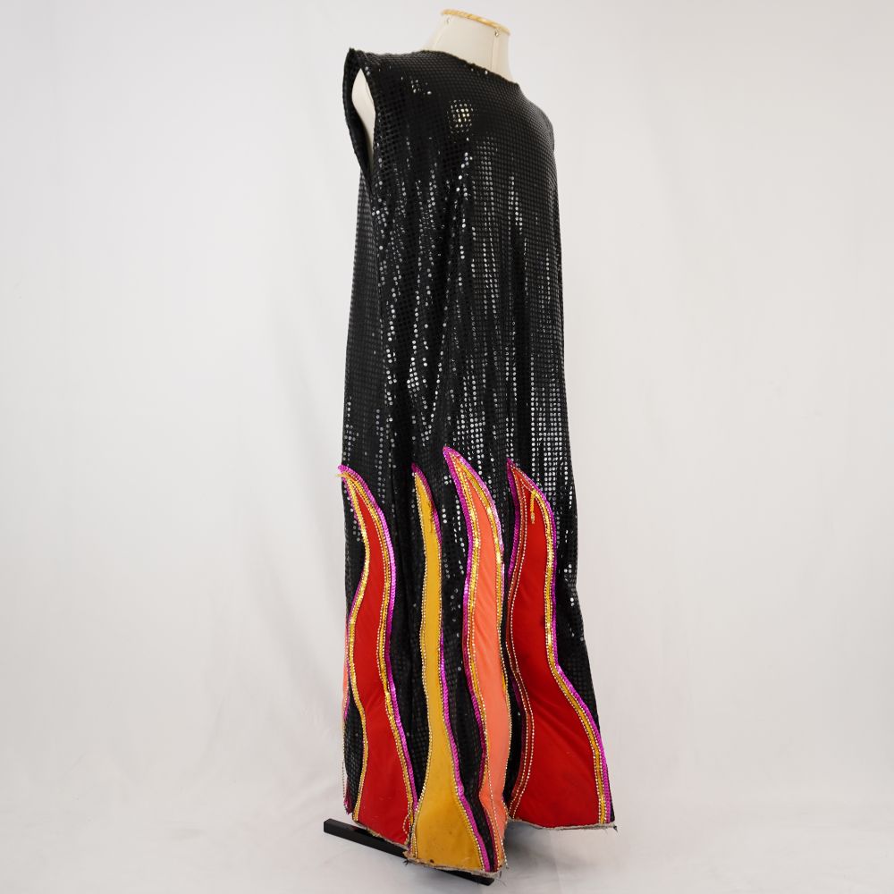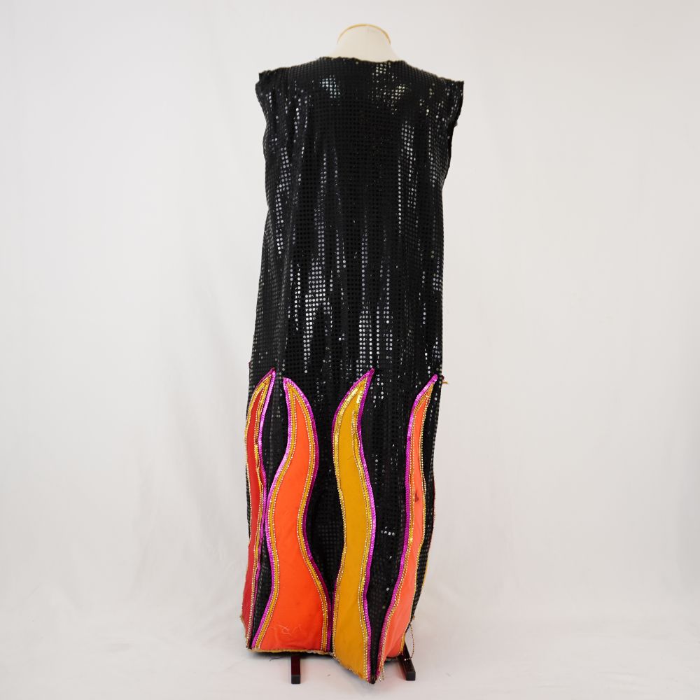 Vestido sem mangas longo em paytex preto, com aplicações em formatos de chamas acolchoadas em malha em vermelho, amarelo, laranja com contorno de lantejoula rosa e amarela e cordão de bolinhas matálicas douradas na barra