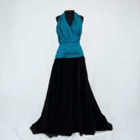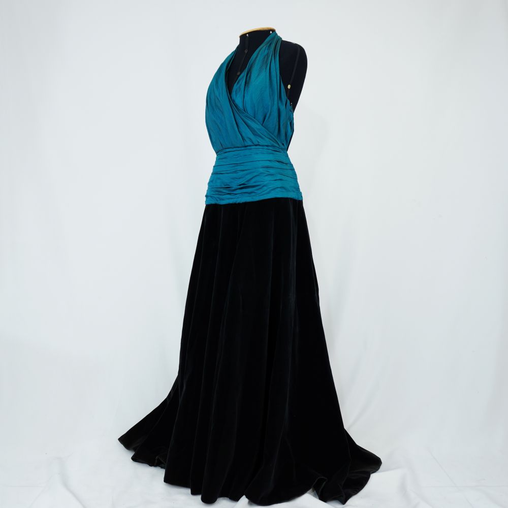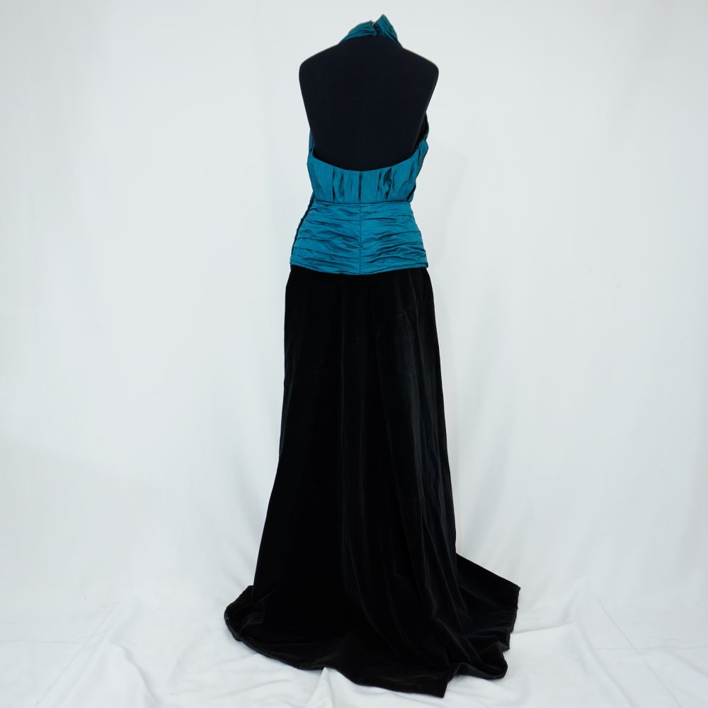 Vestido longo frente única, busto transpassado com cintura drapeada em tafetá turquesa, saia de veludo godê preta, fechamento em colchete no pescoço e lateral com zíper e colchete, forro acetinado preto.