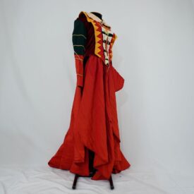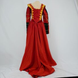 Vestido com cinto de castidade. Vestido tipo de ópera vermelho com parte frontal em patchwork amarelo, branco, preto, vermelho e ornamentos dourados. Parte superior em veludo de malha e tecidos planos e manga em verde musgo e vermelho com ornamentos dourados. Gola branca e saia longa de tafetá vermelho, com abertura frontal e cauda longa