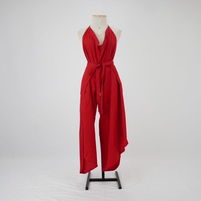 by Michelle Araujo Leia Mais...Calça envelope vermelha com amarração na cintura e barra arredondada