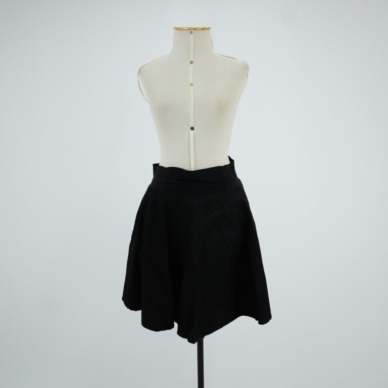 Saia curta godê preta com dois bolsos embutidos nas laterais, cós largo com detalhe em “V” no meio frente e meio costas, elástico largo nas laterais e fechamento...