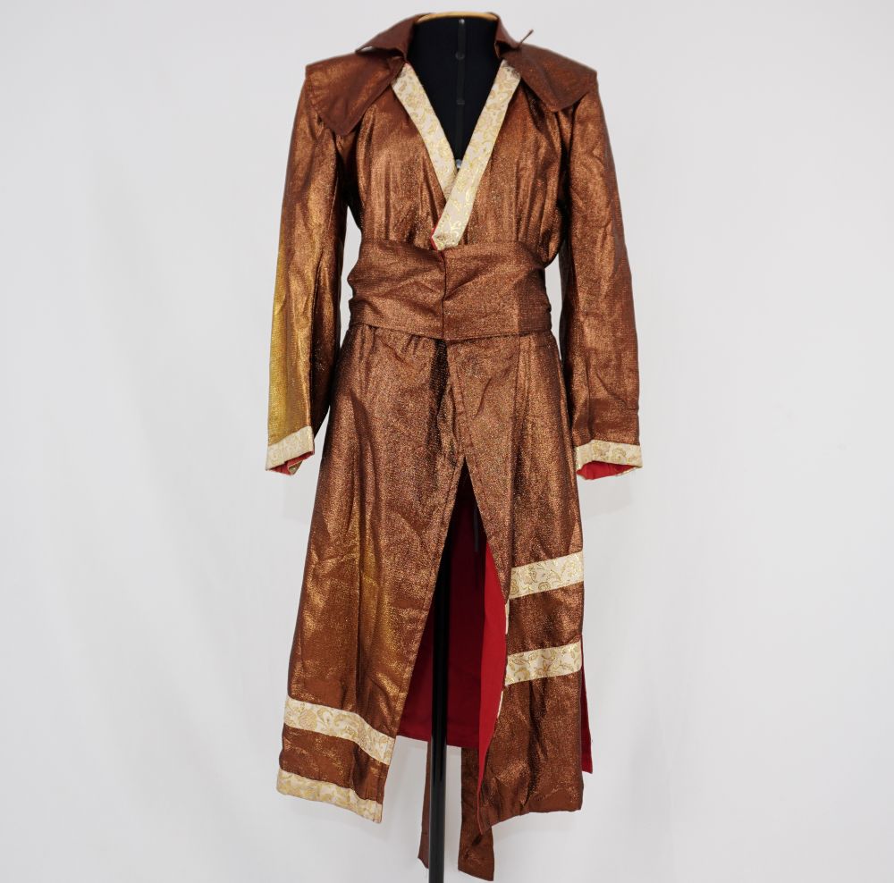 by Michelle Araujo Leia Mais...Casaco em lurex marrom e dourado, gola dupla, Jacquara bege com estampa dourada na brra, punho e decote. Forro vermelho, faixa em lurex costuradas na cintura para amarração...