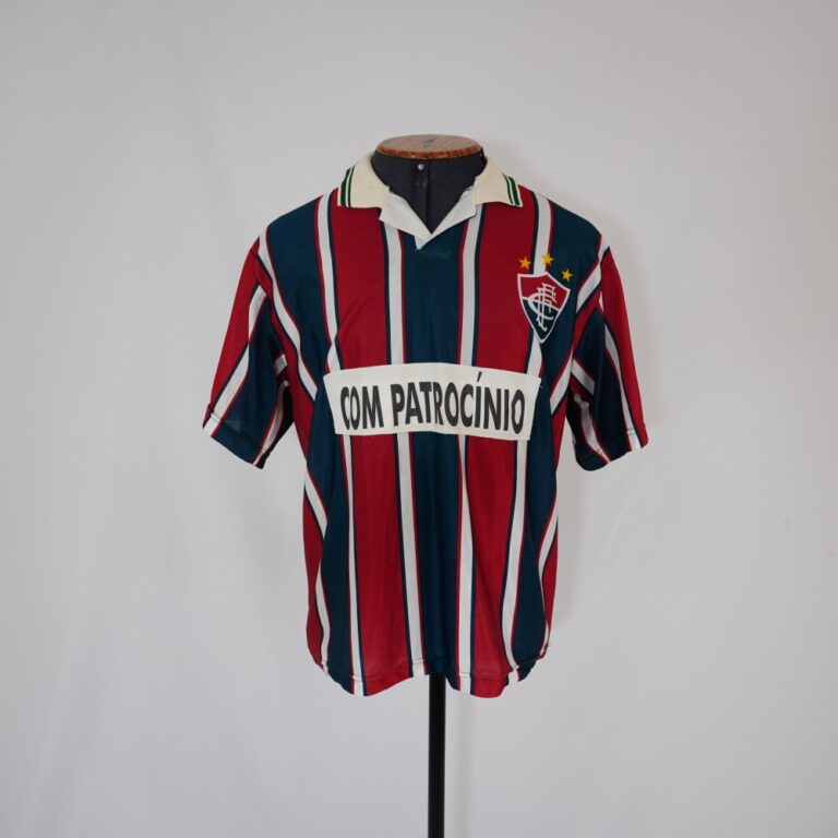 by Michelle Araujo Leia Mais...Camiseta esportiva com listras verticais em vermelho, verde petróleo, branco, gola polo com listra verde, símbolo do fluminense na lateral esquerda, número 10 nas costas e malha costurada...