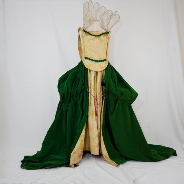 by Michelle Araujo Leia Mais...Vestido da Rainha Mary Stuart, saia de veludo verde e parte frontal Jacquard dourado com crinolina de arame com espuma. Blusa estilo corset de tecido Jacquard dourado com...