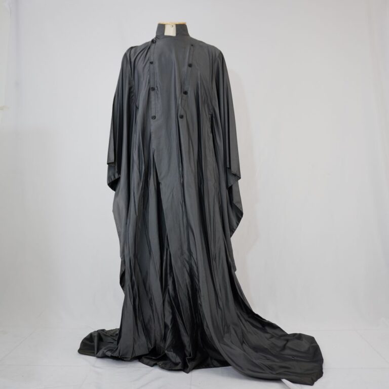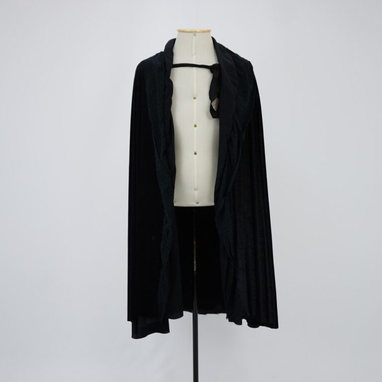 by Michelle Araujo Leia Mais...Capa longa preta, forrada, feita em veludo listrado com gola de poá em relevo. Fechamento com duas faixas de elástico