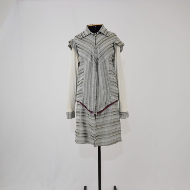 by Michelle Araujo Leia Mais...Casaca em jacquard cinza listrado, mangas em malha acetinada offwhite, detalhe de aba nas cavas/ombro, punho duplo em jacquard e tecido branco em babado, passamanaria bordô na região...