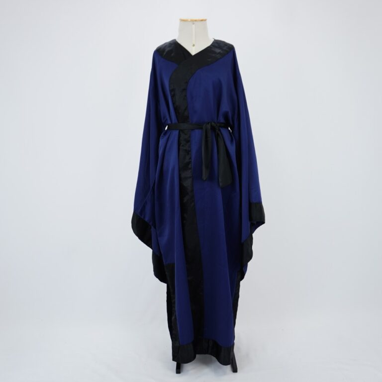Kimono longo com manga pendente na cor azul marinho e barra, punho e decote na cor preta. Fechamento com faixa de amarração preta e um ponto de velcro...