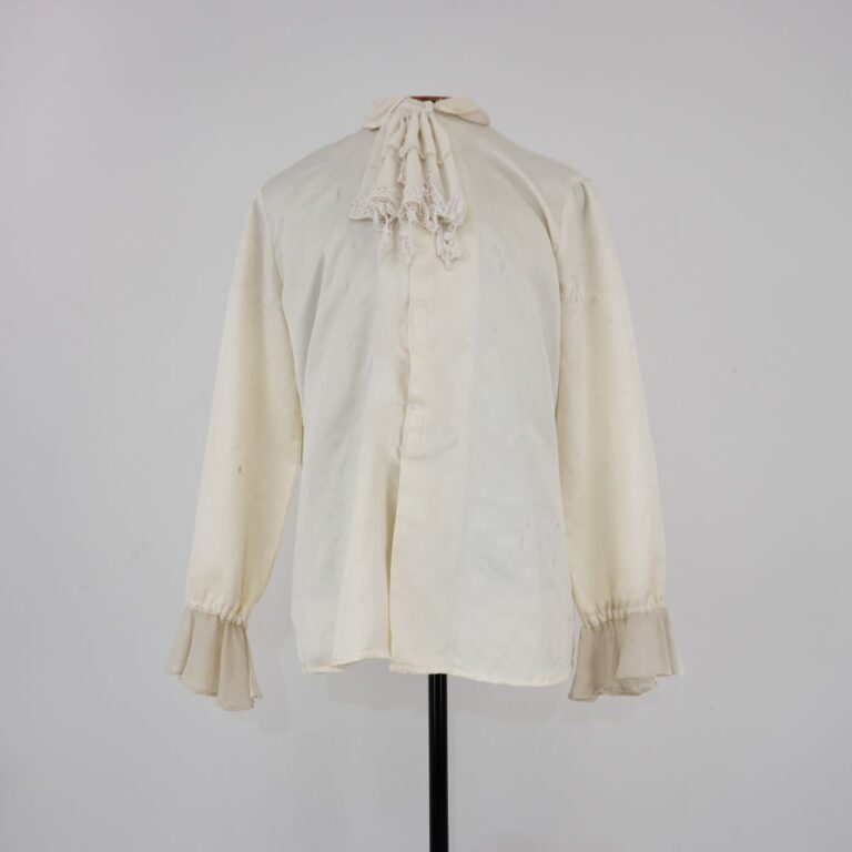 Camisa longa offwhite com punhos de babado transparente. Detalhe tipo jabô curto feito em tecido transparente branco com renda nas barras e fechamento por colchete e velcro.