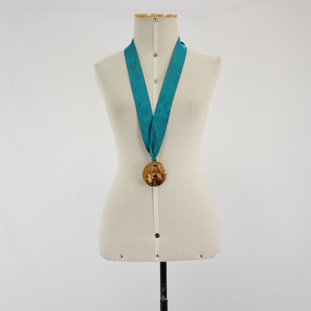 by Michelle Araujo Leia Mais...Medalha de Nossa Senhora do Carmo com menino Jesus em imagem amarelada e verso dourado, presa a fita de cetim azul celeste com amarração na extremidade