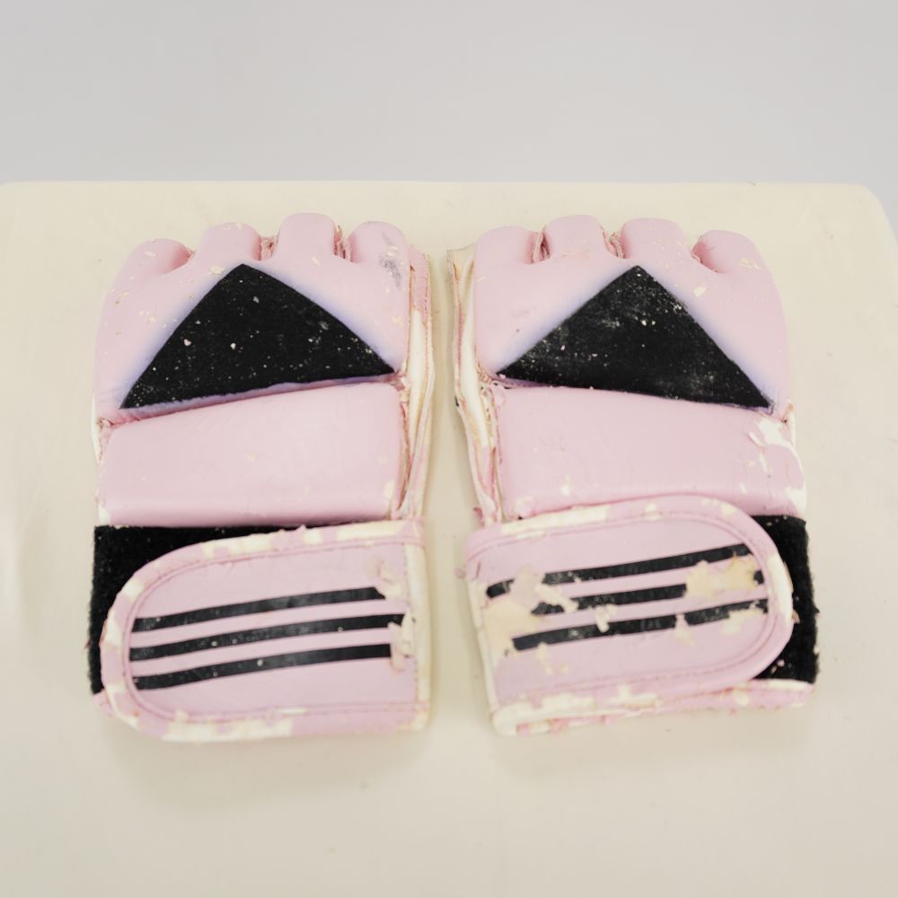 by Michelle Araujo Leia Mais...Luva de meio dedo de boxing rosa claro, fechamento em velcro, duas aberturas na palma da mão, detalhe triangular no dorso em preto e listras no pulso