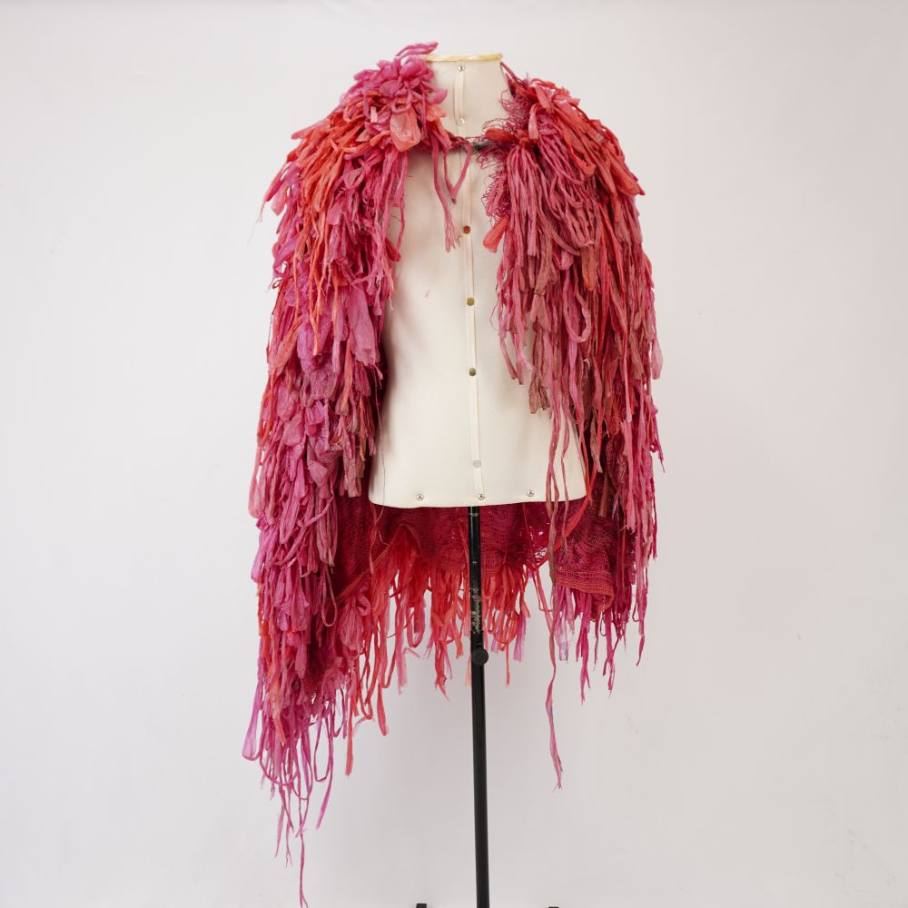 by Michelle Araujo Leia Mais...Manto com base de sacaria e franjas de sacos plásticos em tons de rosa. Fechamento com mosquetão frontal.