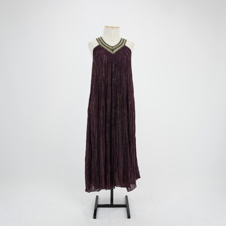 Vestido longo vinho com frisos dourados sem mangas. Gola em “v” de pala de passamanaria dourada e preta.