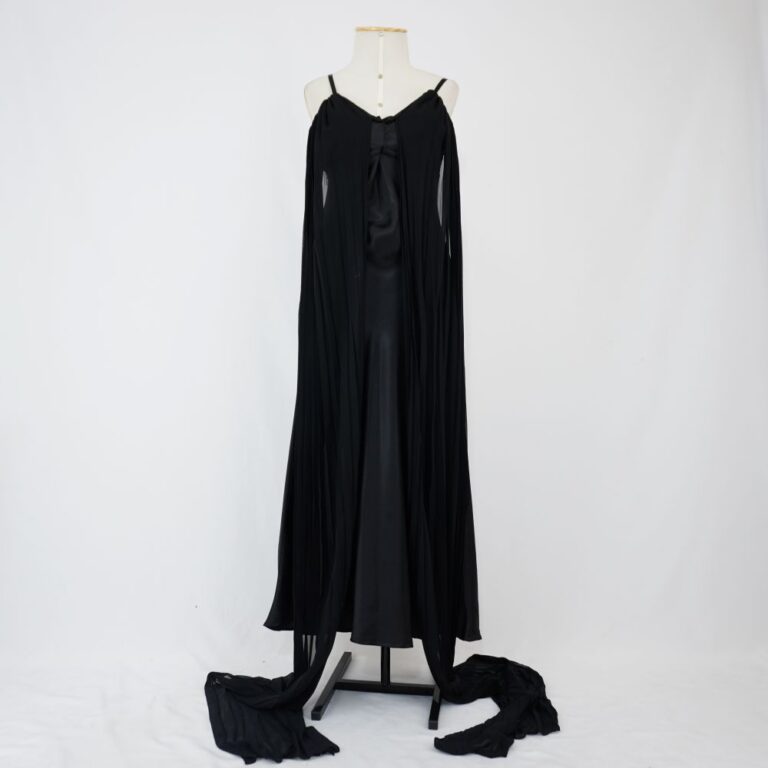 by Michelle Araujo Leia Mais...Vestido preto longo de alcinha com bojo embutido, aplique no busto com faixas de musseline preta plissada, com forro e fechamento na lateral com zíper