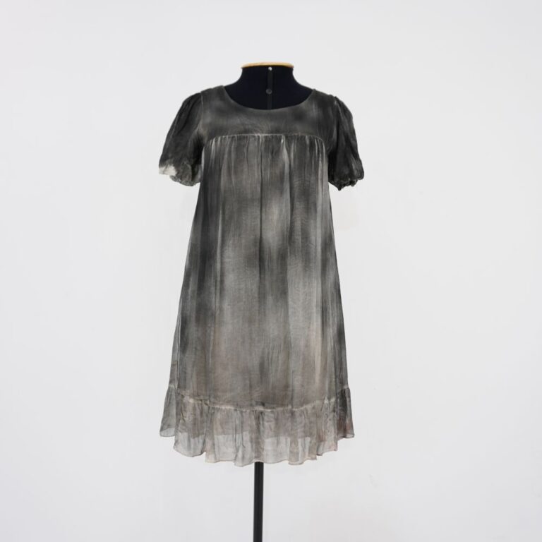 by Michelle Araujo Leia Mais...Vestido curto preto e bege forrado de manga curta bufante, decote redondo e barra de babado. Recorte horizontal no busto. Pintado manualmente