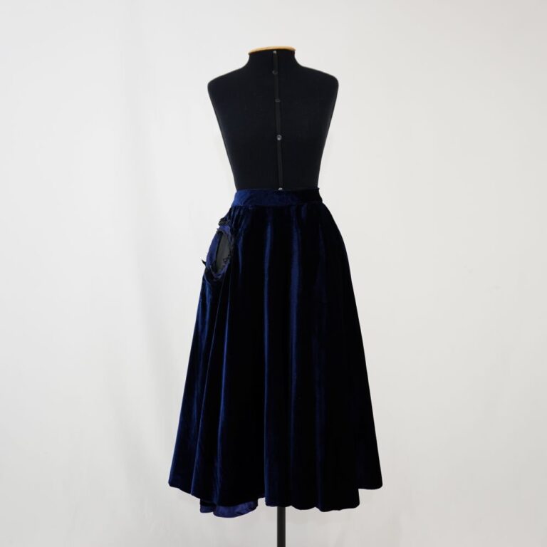 by Michelle Araujo Leia Mais...Saia godê curta em malha de veludo azul marinho com barra a fio, forro de cetim azul marinho, fechamento em zíper e colchete no cós das costas