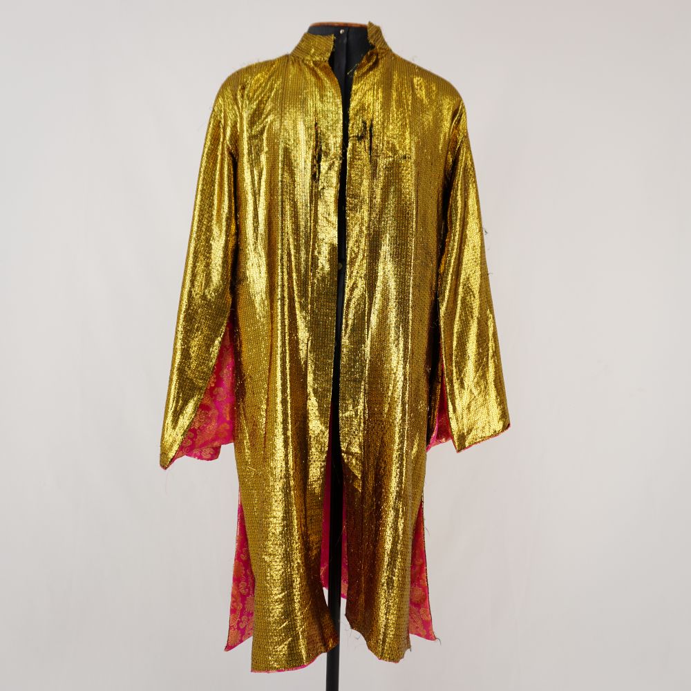 by Michelle Araujo Leia Mais...Quimono dupla face, uma parte jacquard rosa com dourado e outra dourado com preto, mangas com abertura