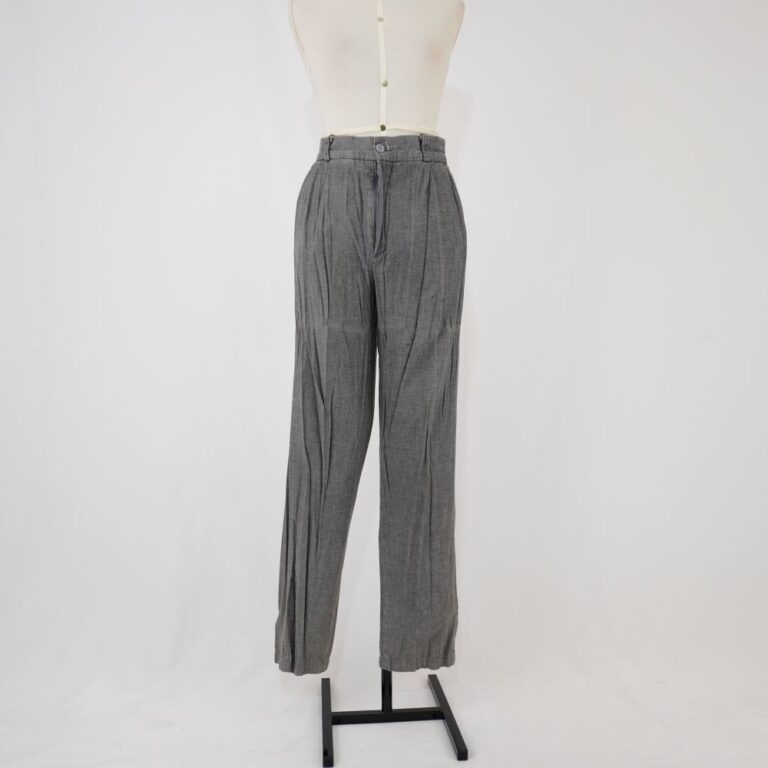 by Michelle Araujo Leia Mais...Calça de alfaiataria reta, cinza com 4 pregas frontais, dois bolsos frontais, fechamento em zíper e botão de plástico, cinco passantes no cós