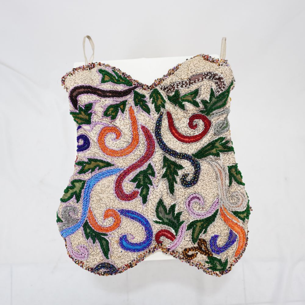 by Michelle Araujo Leia Mais...Bustiê sem alças, base em tecido plano bege estampado com formas orgânicas pretas, aplicações com bordados de miçangas coloridas e cordões, zíper e colchete para fechamento no centro...