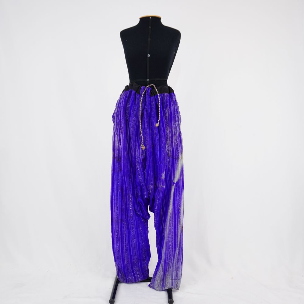 by Michelle Araujo Leia Mais...Calça Saruel em veludo devorê roxo e feios de lurex prata, bolsos na lateral, ajuste no cós com cordão e cós em cambraia preta
