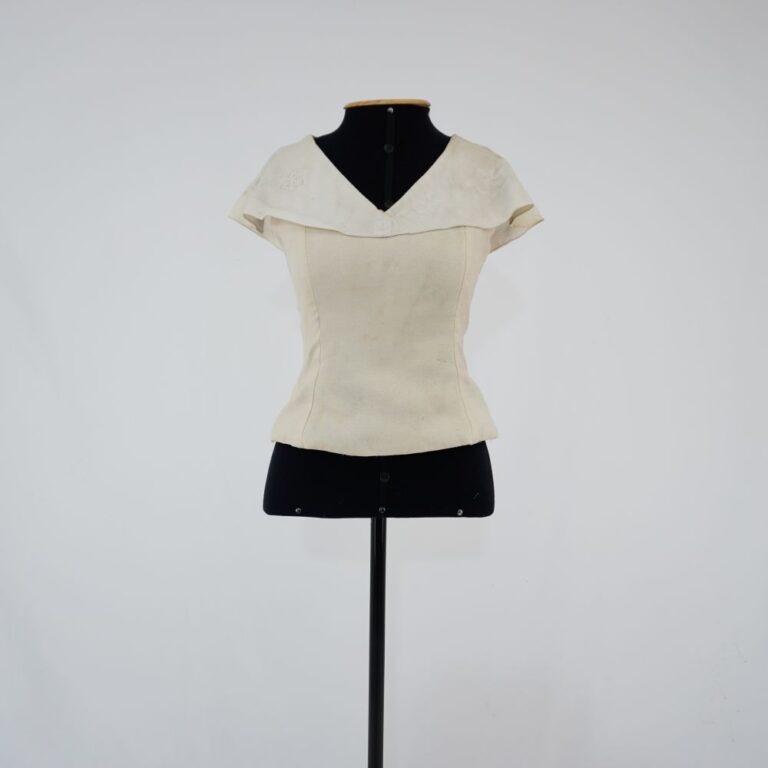 Blusa off white com duas pences frontais e duas traseiras em camada dupla de tecido, gola grande estilo xale branca com bordados florais. Fechamento em zíper na lateral....