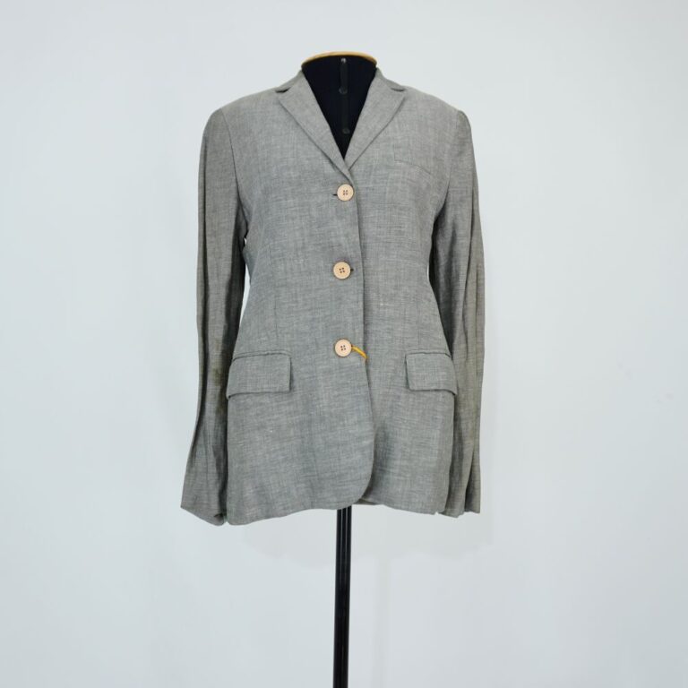 by Michelle Araujo Leia Mais...Blazer cinza com forro verde, fechamento em botão de plástico na frente e nos punhos.