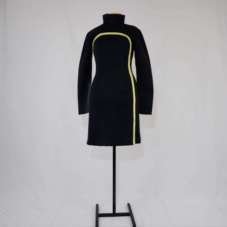 Vestido midi preto com gola alta e manga longa com uma linha verde que vai da do busto até a barra pela lateral do vestido