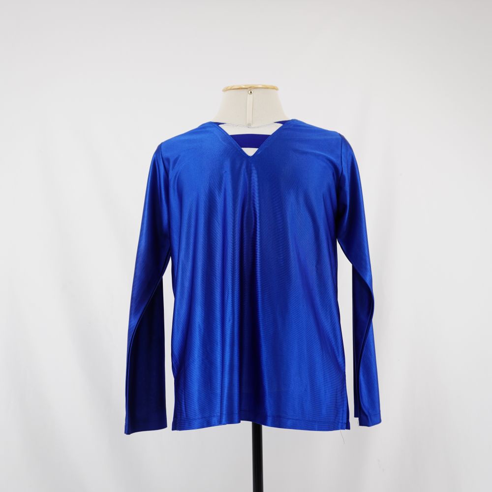 by Michelle Araujo Leia Mais...Blusa manga longa, azul royal com decote “V” e detalhe listrado azul e branco no decote.