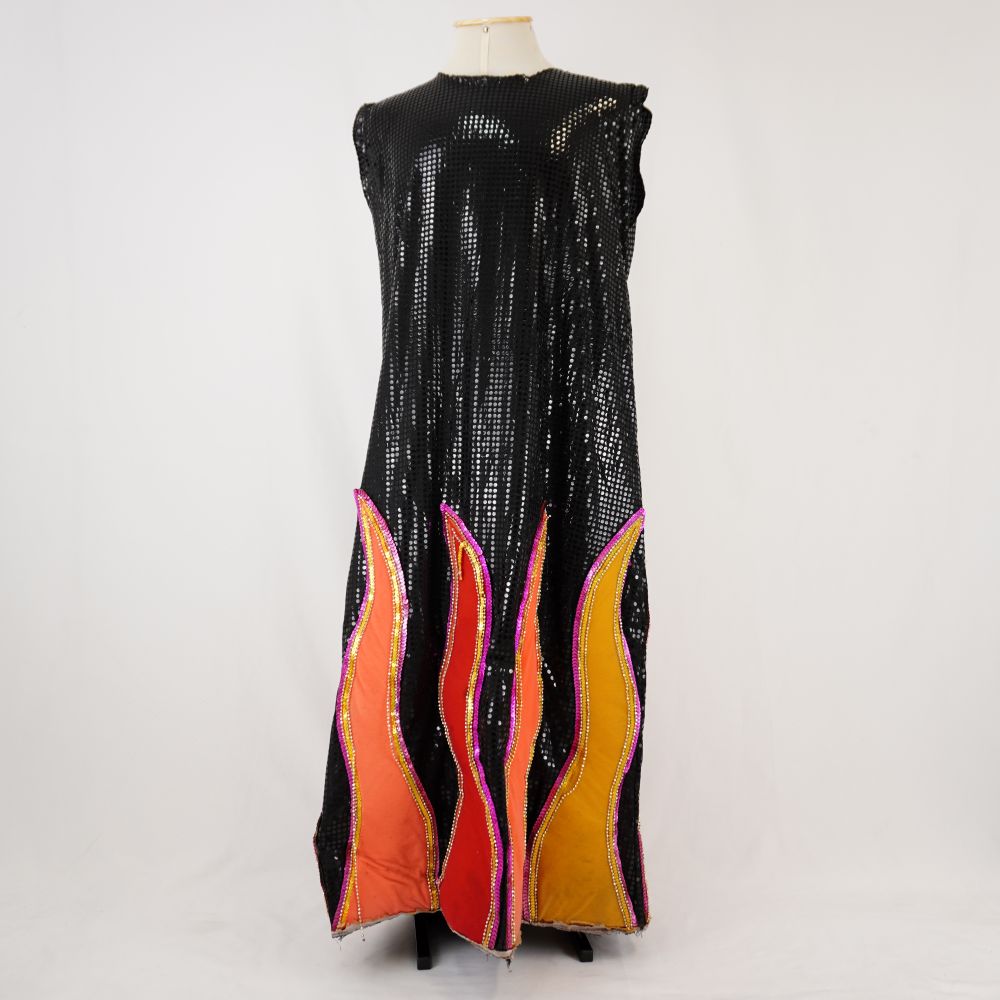 by Michelle Araujo Leia Mais...Vestido sem mangas longo em paytex preto, com aplicações em formatos de chamas acolchoadas em malha em vermelho, amarelo, laranja com contorno de lantejoula rosa e amarela e...