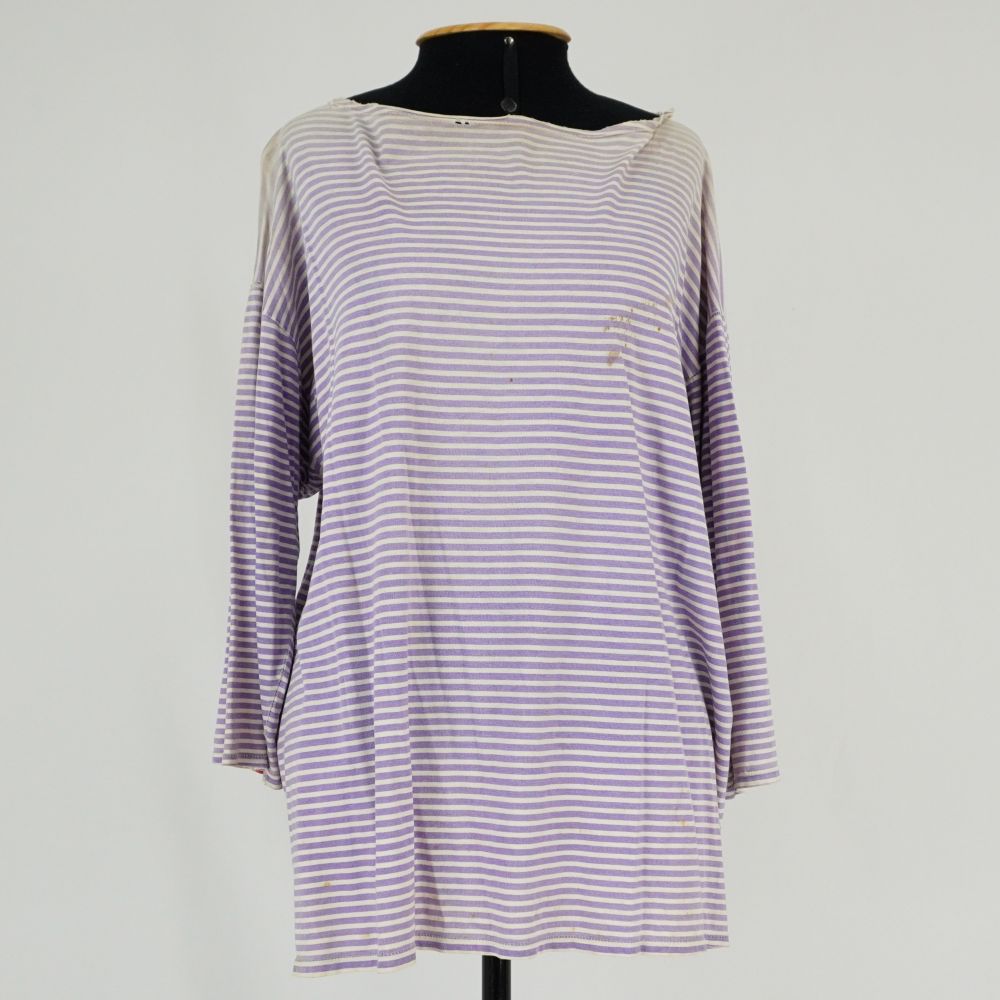 by Michelle Araujo Leia Mais...Camiseta ampla com manga 7/8 em malha listrada lilás e branco