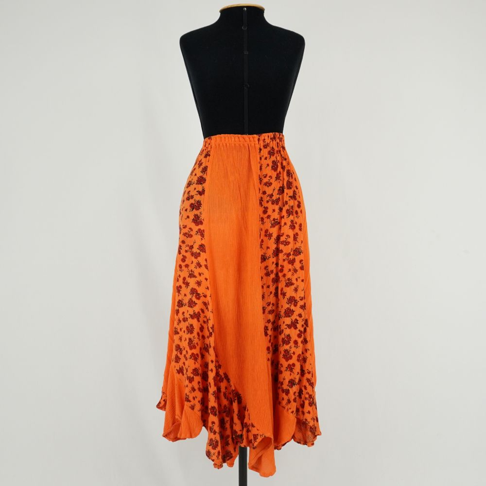 by Michelle Araujo Leia Mais...Saia longuete feita em faixas curvas em tecido plano plissado intercalado com faixa com e sem estampa, estampa com motivos florais na cor preta e vermelha, elástico na...