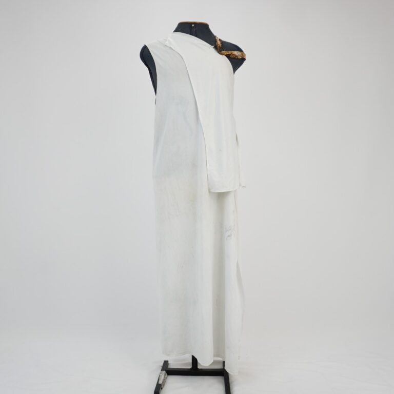 by Michelle Araujo Leia Mais...Vestido túnica branco longuete, sem mangas com sobreposição de falha pendente em um dos lados, com um ombro em alça dupla com faixa de tecido animal print em...