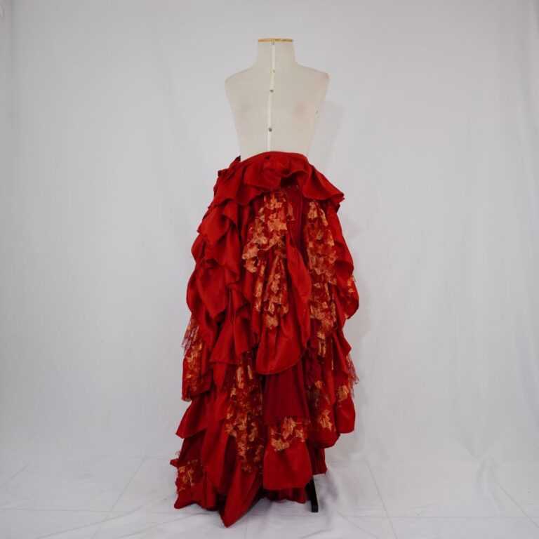 Saia envelope vermelha com babados assimétricos vermelho e dourado, cós com amarração
