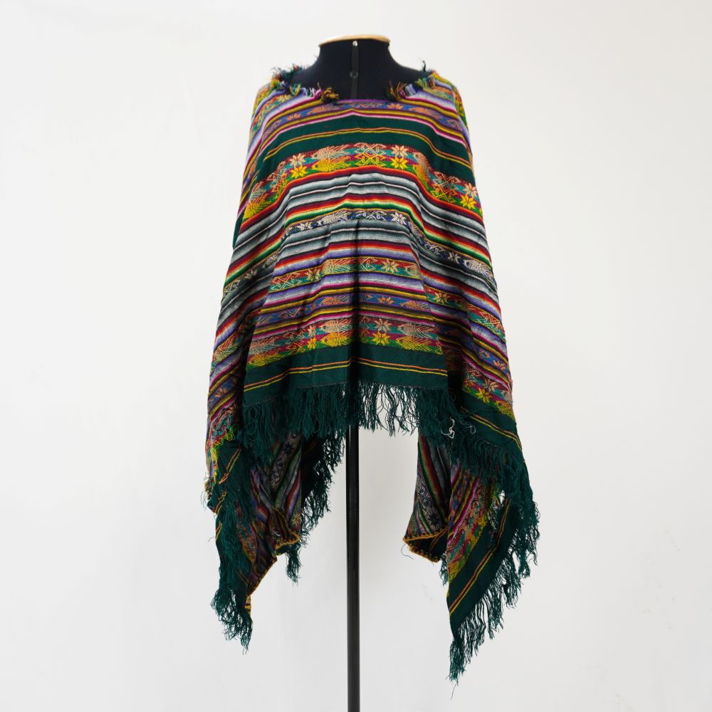 Poncho peruano com listras verticais vibrantes em diversas cores, incluindo tons de verde, amarelo, vermelho e azul, algumas listras são mais largas e contém desenhos geométricos e florais,...