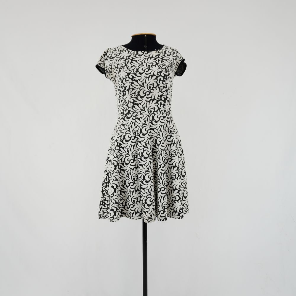 by Michelle Araujo Leia Mais...Vestido curto de mangas curtas em tecido de malha com motivo floral em preto e branco. Detalhe em viés de malha preto no acabamento da gola e mangas....