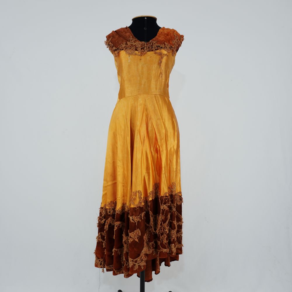 by Michelle Araujo Leia Mais...Vestido de cetim e renda nas cores ocre e marrom com rendas aplicadas no decote e barra. Decote de ombro a ombro. Saia desce evasê abaixo do busto,...