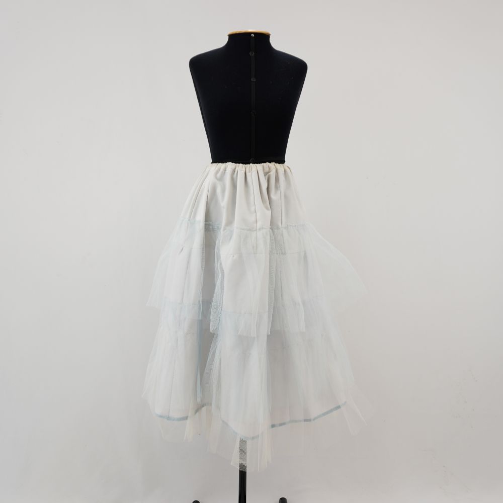 by Michelle Araujo Leia Mais...Saiote de baiana, volumosa, base branca com aplicações de babados de tule azul claro e branco. Ajuste na cintura com canaleta e cordão de ajuste de amarração. Barra...