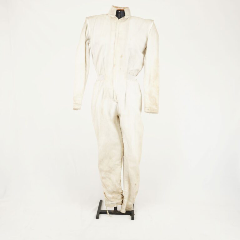 Macacão off White estilo autobilista com a lateral da perna exagerada, com gola alta, mangas de tecido texturizado, zíper frontal e feixos na frente e cintura