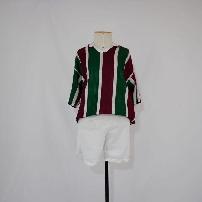 by Michelle Araujo Leia Mais...Camiseta esportiva canelada com listras verticais em verde, bordô e branco, gola polo na cor branca, número 9 nas costas