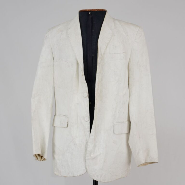 by Michelle Araujo Leia Mais...Blazer pintado de branco, três bolsos internos e três externos, fechamento com botões de plástico também pintados com tinta branca e forro branco