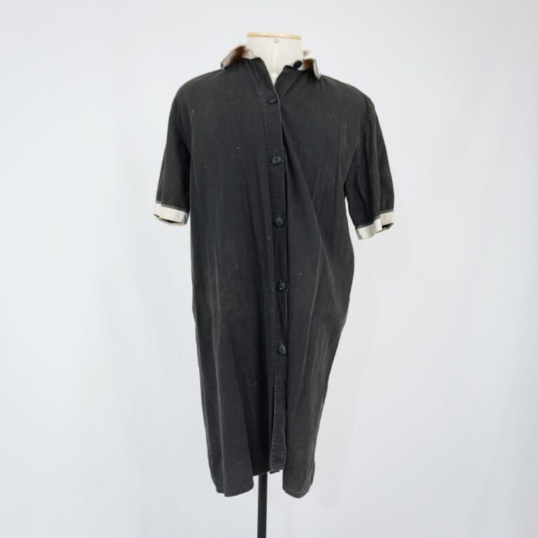by Michelle Araujo Leia Mais...Vestido modelo uniforme preto, com gola e barra na manga em canelado branco, vista simples com fechamento de botões de plástico