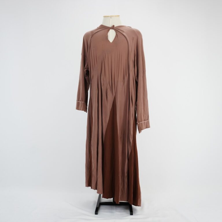Vestido túnica marrom longo com manga longa e capuz. Pesponto rosa claro na barra das mangas. Aplicação de 4 nesgas na barra. Decote frontal cortado a fio.