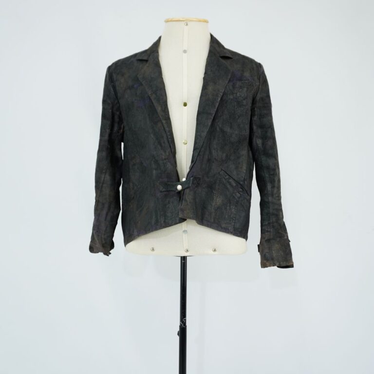 Jaqueta de tecido azul que foi toda pintada e preto, três bolsos frontais, fechamento com um botão e escrito em tinta branca na parte das costas “Treplev 11)