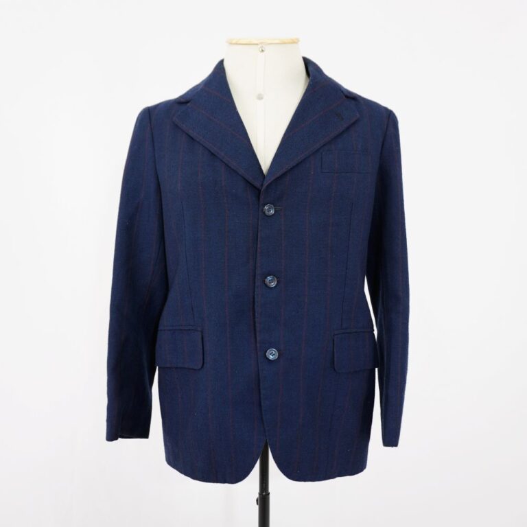 by Michelle Araujo Leia Mais...Paletó azul marinho com listras verticais vermelhas, três bolsos externos e quatro bolsos internos, fechamento em três botões de plástico e três em cada punho, forro em cetim...