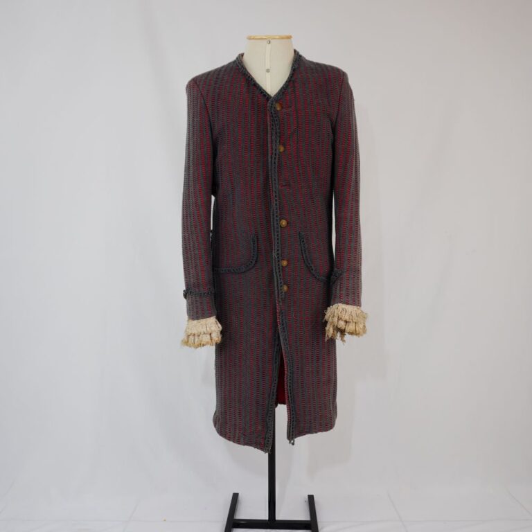 by Michelle Araujo Leia Mais...Casaco tipo sobretudo com ombreira, malha texturizada com tricô cinza e malha vermelha, forro em tafetá vermelho, punho com renda de algodão e passamanaria de franja. Fechamento em...