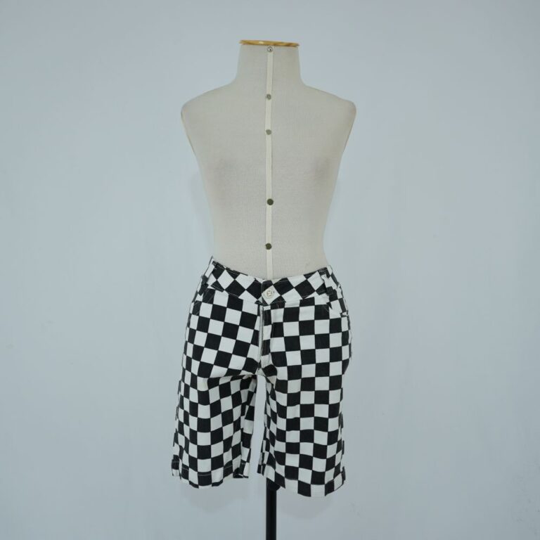by Michelle Araujo Leia Mais...Bermuda quadriculada preta e branca, cós de calça com passador, botão de plástico branco com detalhes em prateado.