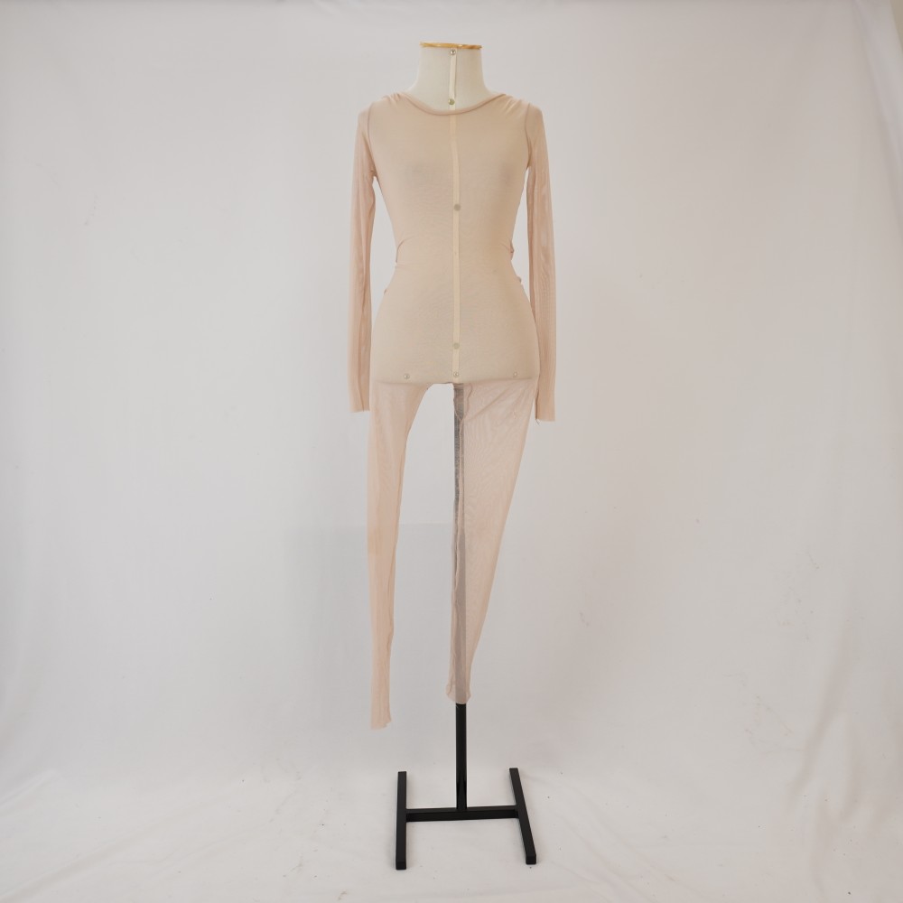 by Michelle Araujo Leia Mais...Macacão justo ao corpo tipo 2ª pele em tule de malha bege. Barra de manga e calça a fio e decote com galão do mesmo tecido