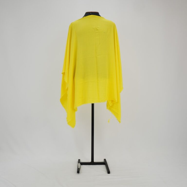by Michelle Araujo Leia Mais...Túnica de modelagem ampla em tecido fluido amarelo. Abertura para passagem da cabeça no meio do tecido e todas as barras a fio.